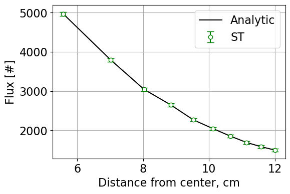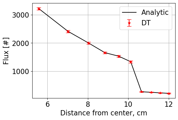 In summary, surface tracking, standard delta tracking, and weighted delta tracking were analyzed against analytic solutions to neutron transport through concentric spherical shells with heterogenous macroscopic cross sections. By varying the number of shells and the macroscopic cross sections, the differences between solution methods were identified. Delta tracking and weighted delta tracking were penalized in case 2 due to the insertion of a large macroscopic cross section. Surface tracking was penalized when the number of regions, therefore surfaces, was increased. From these results, the times in which one uses different algorithms is dependent on the physical system modeled. Overall, all algorithms were in good agreement with the analytic solutions. It is interesting to see the performance differences in the presented algorithms and the different use-cases for each.