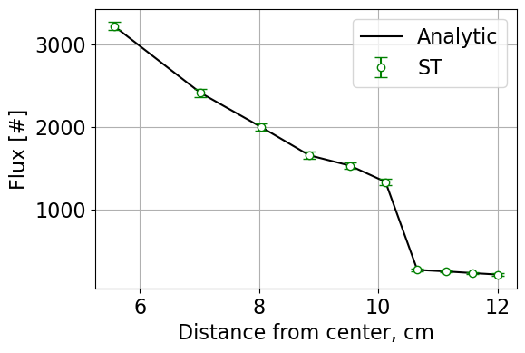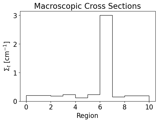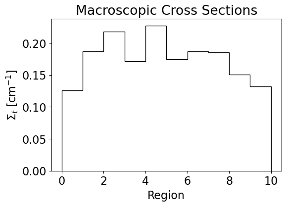 Using the ST, DT, and WDT routines, the following flux results were obtained. The cross sections are given by the histogram below. The flux tally in each of the ten regions is overlaid on the analytic flux for the given cross sections. The case that generated these plots was 100 simulations at 10000 neutrons with a outer radius of 12 cm \(^{-1}\).