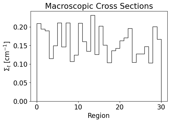 The third case returned cross sections to being uniformly distributed between 0.1 and 0.25 cm \(^{-1}\). However, this case used 30 regions. Again the same simulation parameters were used. The resulting flux plots were obtained with the cross sections shown below.