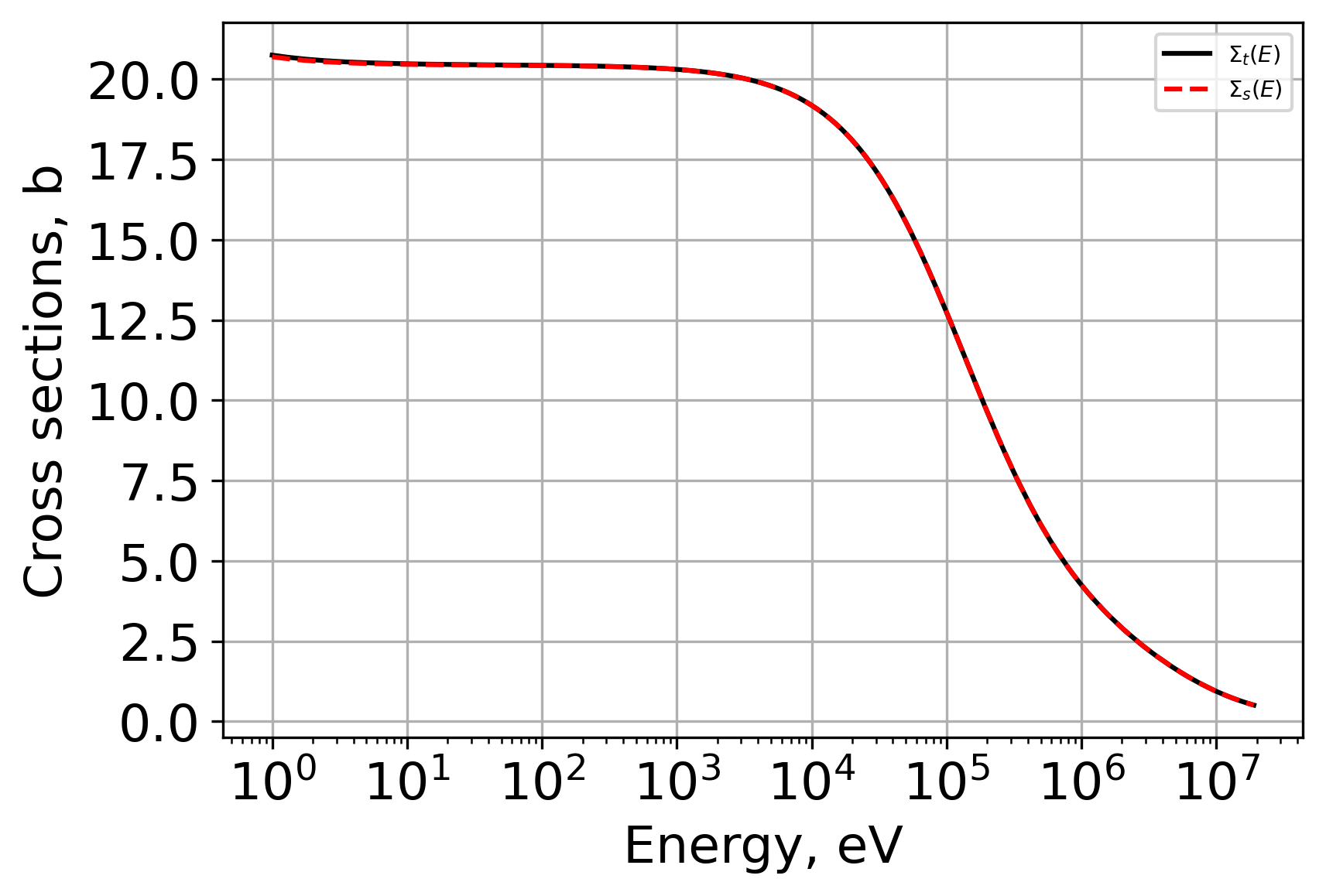 Hydrogen-1 (H-1) cross section data is provided below. This data supports an assumption that that absorption cross section data is ignored, and that scattering and total cross sections are approximately equal.