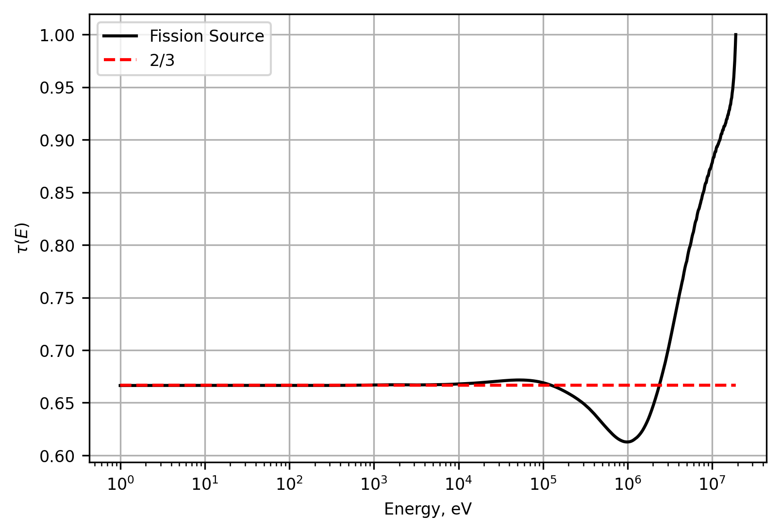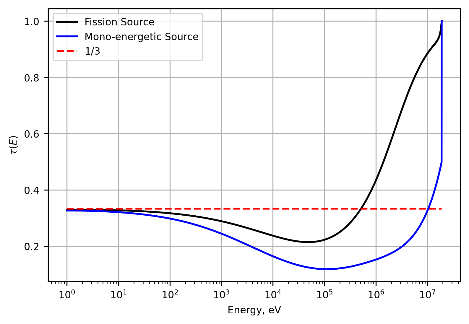 The TCR is found by matrix inversion for both the fission source flux spectrum and the mono-energetic source flux spectrum to yield the TCR figure below. Both converge to the expected \(\tau_{0}=1/3\) as E→0. The mono-energetic source produces a rapid decrease and large undershoot at higher energies. The sharp change in TCR is due to the rapidly changing flux spectrum.