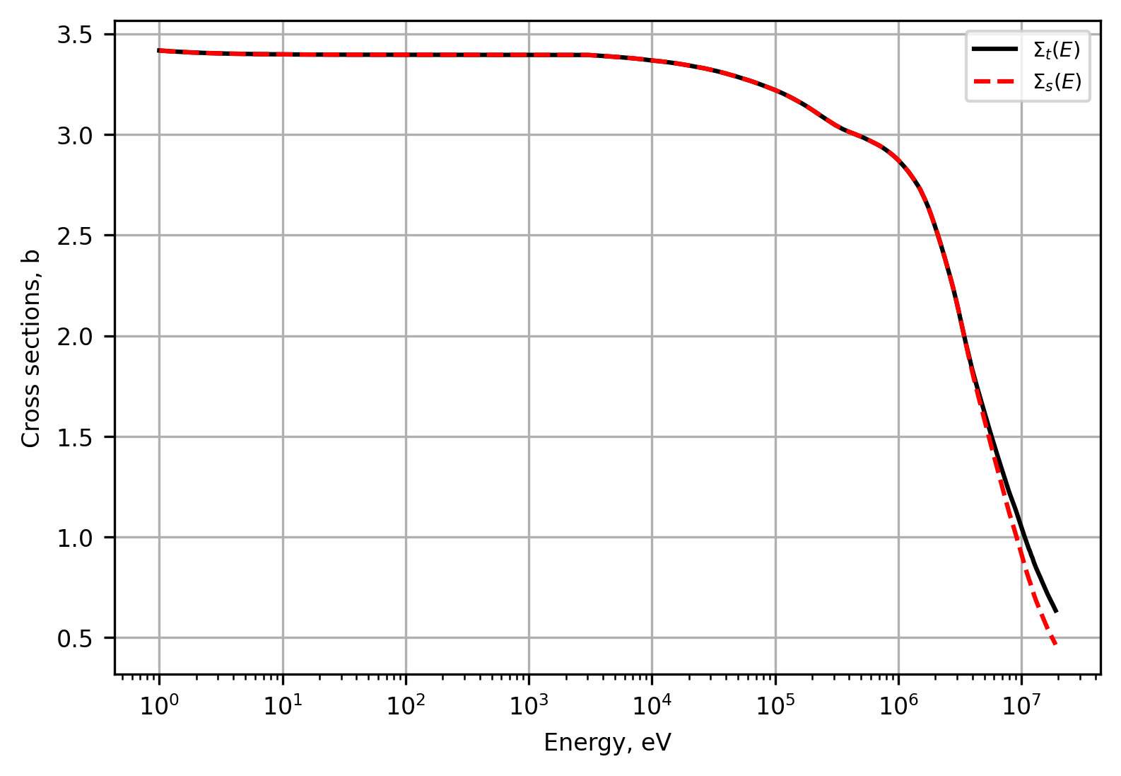 The scattering and total macroscopic cross section data used in calculating the flux spectrum and TCR for H-2 is provided below. The cross sections differ at the highest energies but remain consistent throughout most of the energy range considered. Using the data below and the fission spectrum source, the TCR for H-2 is developed.