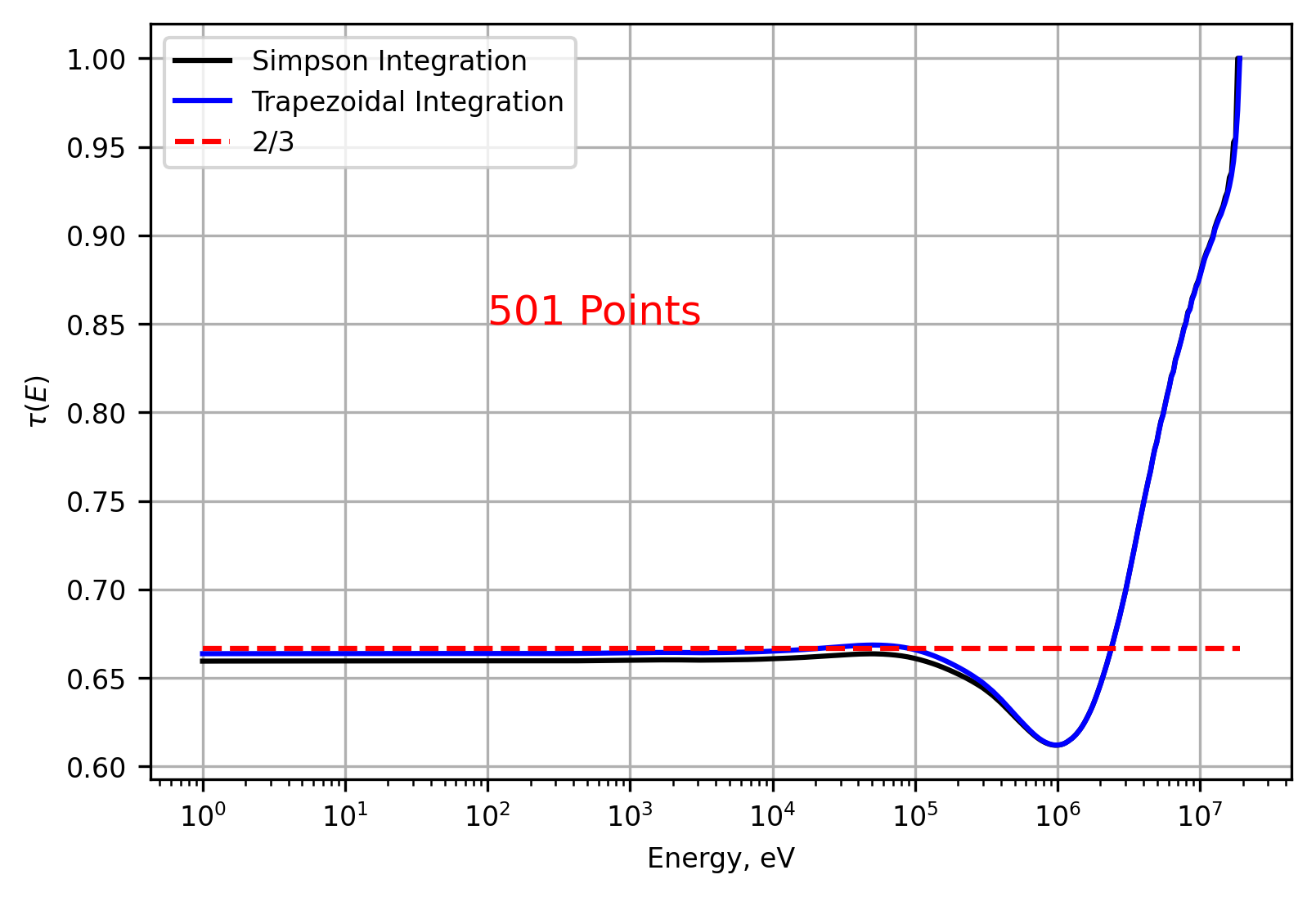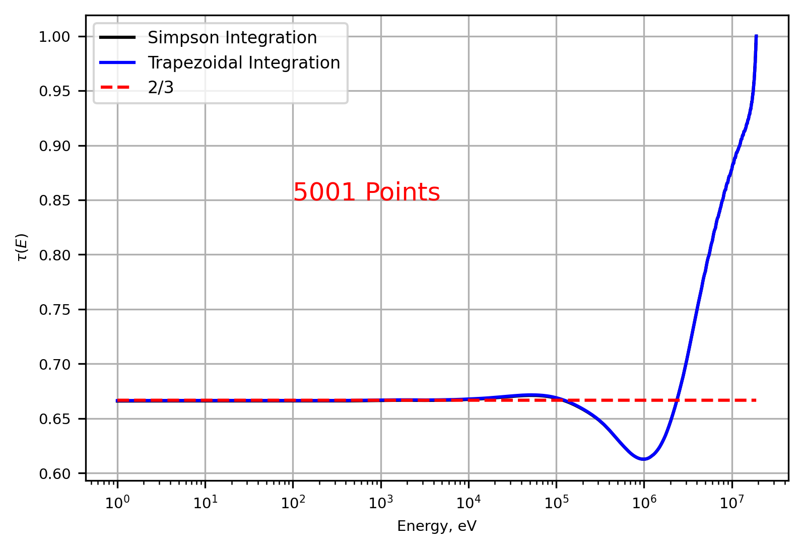The TCRs for both 501 and 5001 energy points are plotted and shown below. At 501 points, there is a discrepancy between the two techniques as E→0. However, increasing the number of energy points by an order of magnitude drastically reduced the relative error between the two methods.