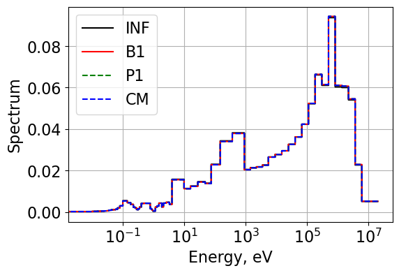 Flux spectrums are generated using the functions SolveB1 and SolveCM. A separate function, CriticalSpectrum, performs the critical spectrum search for the specified method. To calculate P1 critical flux spectrum, the \(a_g(B)\) term is set to 1.