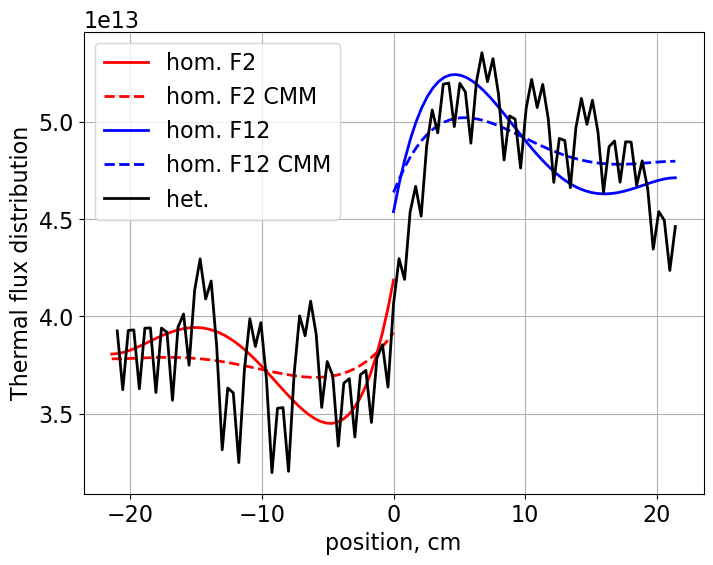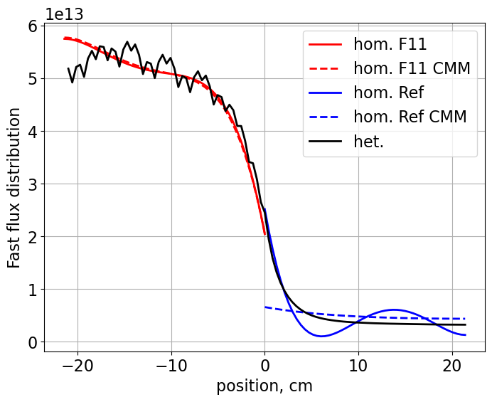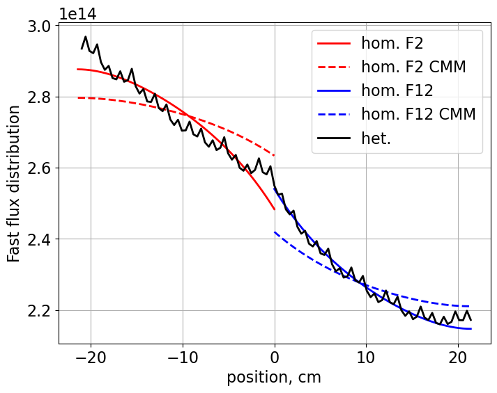 The coefficients of the quadratic are solved via a polynomial interpolation. Finally, a weighted residual scheme is applied, producing a first and second moment of the base diffusion equation. The first and second moment equations are weighted with \(f_{1}\) and \(f_{2}\), respectively. With a set of conservation equations (average flux, net surface currents, weighted residuals) and appropriate boundary conditions supplied by the heterogeneous solution from Serpent, the 1D homogeneous flux distribution is obtained simultaneously through